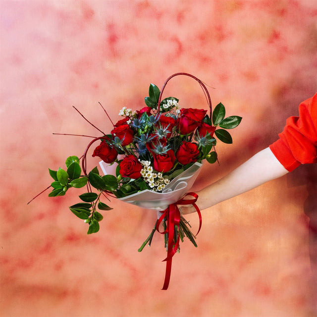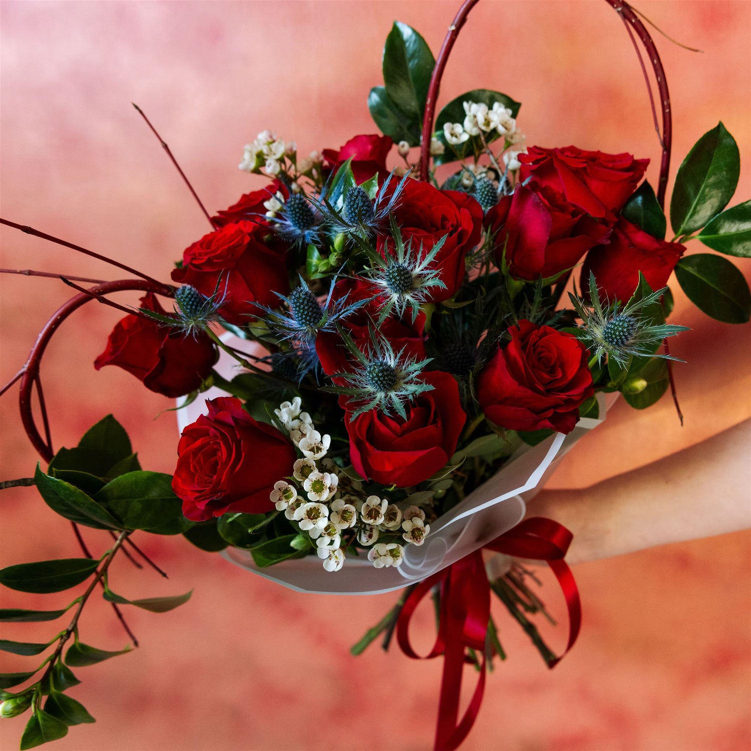 A rustic and woodsy wrapped bouquet of a dozen roses, waxflower, dogwood and thistle. Romantic and wild!